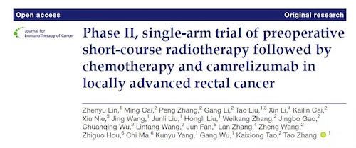 2021年11月1日,一项由华中科技大学同济医学院附属协和医院肿瘤中心张涛教授和陶凯雄教授团队开展的“短程放疗(SCRT)序贯卡瑞利珠单抗联合CAPOX新辅助治疗后延迟手术治疗局部晚期直肠癌(LARC)的单臂II期研究(NCT04231552)”成果在The Journal for ImmunoTherapy of Cancer上全文发表。该杂志是肿瘤免疫治疗学会的官方期刊,2018年IF为8.728分,在158本免疫学SCI期刊中排名第12,2021年IF已升至13.751分。