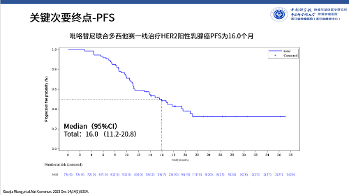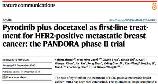 近日,由中国科学院大学附属肿瘤医院(浙江省肿瘤医院)王晓稼教授牵头开展的“吡咯替尼联合多西他赛一线治疗HER2阳性转移性乳腺癌的开放、多中心Ⅱ期临床研究(PANDORA)”正式发表于国际知名杂志《自然》杂志子刊《自然·通讯》(Nature Communications, IF: 16.6)[1]。该研究结果表明,吡咯替尼与多西他赛的联合治疗显示出良好的抗肿瘤活性,并带来了无进展生存期(PFS)获益。